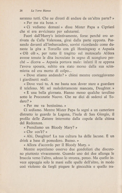 Instinctively outside Harry's, perhaps because I had come from Calle Valeressa, I turned the other way. Passing in front of the landing stage, I smiled remembering how during the trip to Torcello with the Hemingways and Aspasia "Ole ole," all the way on the motorboat Afdera had kept his fingers crossed as a sign of conjuration because - he said - Aspasia was bad luck: in fact, as soon as he married her, he was immediately bitten by her little monkey and died suddenly...